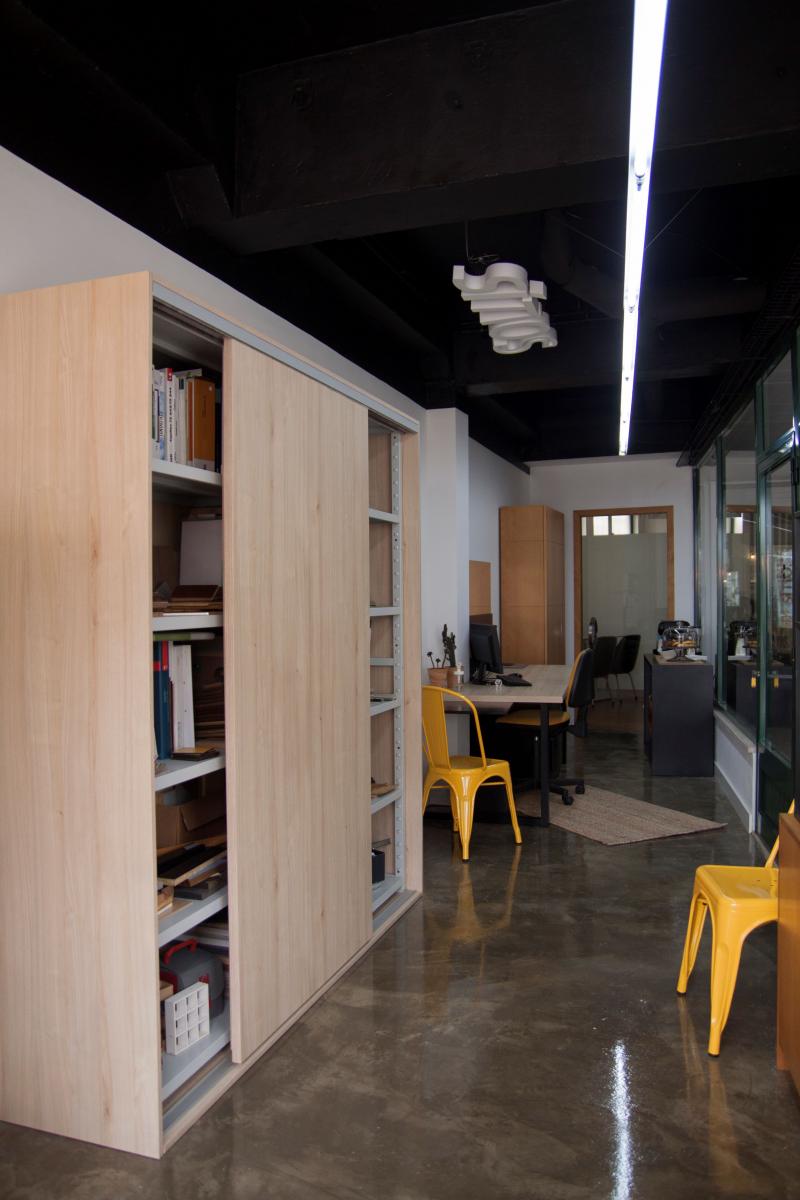 Optámos por manter o teto original do edifício, pintando-o apenas de preto, para as paredes escolhemos o branco, que conjugámos com uma faixa amarela que percorre o teto e uma parede. No chão aplicámos verniz epóxi com brilho. A iluminação foi feita no sentido longitudinal a partir de uma calha que criámos, paralelamente acrescentámos uma calha técnica que nos permite criar/acrescentar vários tipos de iluminação. Em termos de mobiliário foi projetada uma secretária, adequada e específica para o local utilizando vários materiais, um armário com portas de correr para as amostras, um armário que é base de montra e os restantes são armários já existentes que reutilizámos.